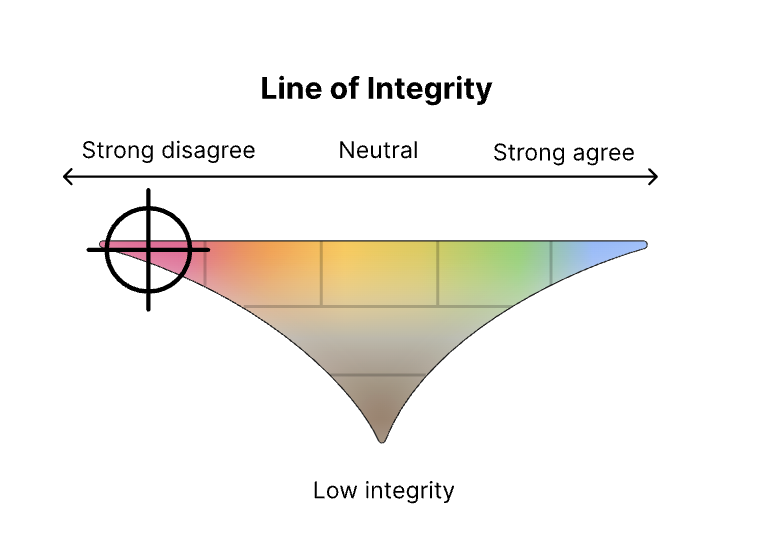 Anyone with an account is able to rate the quality of a statement made in dialogue using the Scoring Triangle as a form of democratic moderation. Statements that are consistently rated “Low integrity” are made less visible on the platform.